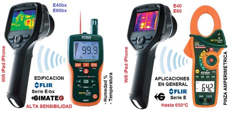 - FLIR SERIE Exx E40-E50-E60= Conexión inalambrica Bluetooth y Wi-Fi con otros instrumentos y con iPAD y iPHONE para Visualizar , editar y enviar Fotos termograficas